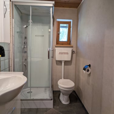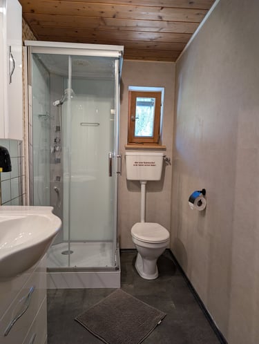 Natürlich stellen wir Ihnen auch frische Handtücher zur Verfügung, sodass Sie sich rundum wohlfühlen können. Das Bad kombiniert gemütlichen Charme mit funktionalem Komfort – ein perfekter Ort, um nach einem Tag in der Natur neue Energie zu tanken.