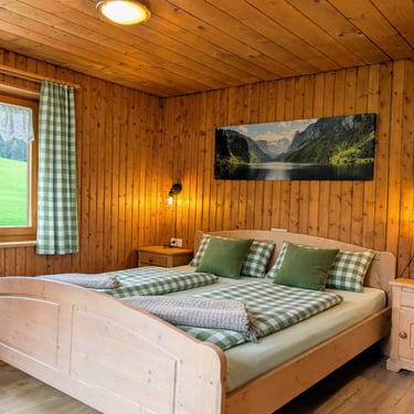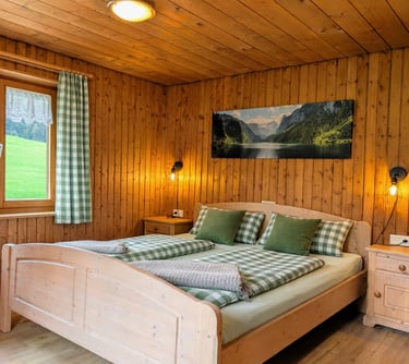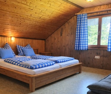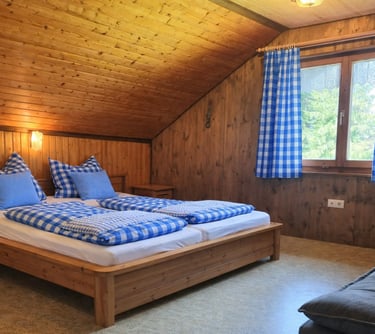 Unsere gemütliche Alphütte verfügt über zwei Schlafzimmer, die jeweils mit einem Doppelbett ausgestattet sind. Das obere Schlafzimmer bietet zusätzlich eine Schlafcouch und somit weitere Übernachtungsmöglichkeiten. Die Hütte ist ideal für Familien oder kleine Gruppen, die Ruhe und Natur genießen möchten.